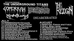 The Underground Titans Tour '92 was the brainchild of Nightlord guitarist Ferenc Collins and then Gomorrah guitarist Jose Griffin. Having seen the success of the Clash of the Titans tour featuring Megadeth, Slayer, Testament and Suicidal Tendencies which took these bands out of the club circuit and into major arenas, the idea was to take five unsigned but successful bands and take them from the usual pub circuit into the club circuit. Featuring a rotating bill of; Decomposed, Gommorah, Incarcerated, Nightlord and The Reign the tour reached over 2000 people, culminating in a show at London's Marquee Club,[6] and the tour is still universally recognised to this day as the first truly Underground Metal tour. The tour picked up considerable column inches in the only existing Heavy Metal publications of the day, Kerrang![7] and Metal Hammer,[8] as well as a special article in The Sunday Times newspaper, exposure that was otherwise unheard of for unsigned bands at the time.