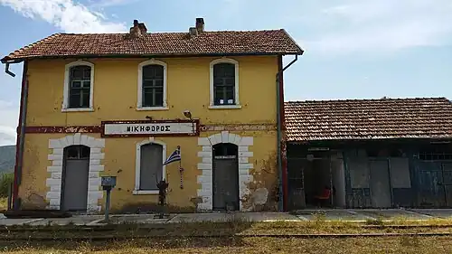 Nikiforos railway station (Greek: Σιδηροδρομικός Σταθμός Νικηφόρου, romanizedSidirodromikós Stathmós Nikiforos) is a railway station that serves the Northern Greek village of Nikiforos, in Drama in East Macedonia and Thrace, Greece. The station is located within the settlement limits. The neoclassical station building (as of 2021) is unstaffed and in a rundown state. The station building and some of its auxiliary buildings have been classified as monuments.