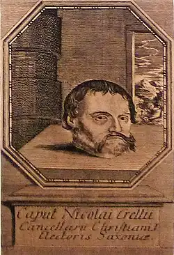 His trial was delayed until 1595, and then, owing partly to the interference of the imperial court of justice (Reichskammergericht), dragged on for six years. At length it was referred by Emperor Rudolph II to a court of appeal at Prague, and Krell sentenced to death.[2] He was decapitated in the Jüdenhof in Dresden on 9 October 1601. He is commemorated by a paving stone with the inscription "Kr" at the spot of his execution in the Dresden Stallhof.