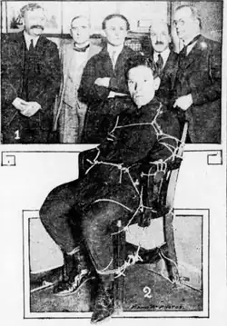 The magician Harry Houdini had not been informed of the test sessions, but managed to get to the fourth séance. Houdini suggested that Percorao was an escape artist who freed himself from the rope that bound him to his chair. Before the séance, Houdini had cut the rope into shorter pieces and tied Pecoraro to the chair. Because of the tight control, no phenomena occurred.[1][3] In 1931, Pecoraro confessed his fraud in a newspaper interview.[5]