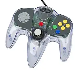 The Nintendo 64 controller (NUS-005) features a distinctive "M"-shaped design, with a "control stick", making Nintendo the first manufacturer to include a thumbstick as a standard feature in its primary controller. While functionally similar to an analog stick, the control stick is digital, operating on the same principles as a ball mouse.[3][4]
