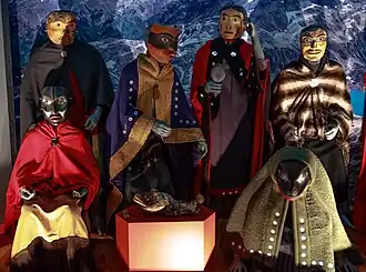 In the late 19th and early 20th centuries, many Nisg̱aʼa artifacts and treasures were destroyed or removed from the Nass Valley by missionaries who established themselves along the Nass River.[4] The Ancestors' Collection (Anhooyaʼahl Gaʼangigatgumʼ ) houses a core collection of over 330 artifacts returned to the Nisg̱aʼa from the Royal British Columbia Museum, the Canadian Museum of Civilization, and the Anglican Church of Canada through the negotiated Nisga'a Treaty.[5][6][7] The entrance to the exhibits is through a replica of a Nisg̱aʼa longhouse which are exhibited in four galleries:[8]