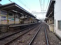 This station consists of two ground-level opposed side platforms serving two tracks, connected to the station building by a footbridge.