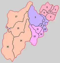 yellow & dark green area=original extent in early Meiji period; light green=area added in Showa period; green=present area; 1=Oguni; 2=Shirataka; 3=Iide