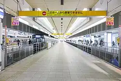 The station is located on the second floor of the Solaria Terminal Building within the Mitsukoshi Building. It uses the Spanish solution with 3 dead-end lines. After the train arrives, the doors open on the middle platform to let the passengers out. After this, the doors on the opposite side will open and the waiting passengers can enter the train.