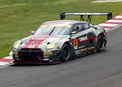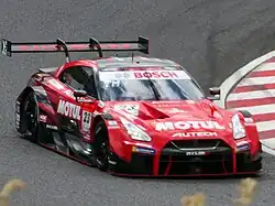 The GT-R Nismo GT3 made its Super GT debut in 2012 at the Okayama International Circuit, with drivers Katsumasa Chiyo and Yuhi Sekiguchi. The car won its first race in the fourth round of the season at Sportsland Sugo, and also scored a podium finish in the following round at Suzuka. It was 4th in the final standings.[26] A couple of difficult seasons followed, in 2013 the car failed to score a single podium finish, in 2014 it only managed to win a race.[27][28] But in the 2013 JAF Grand Prix, team NDDP Racing, with driver Daiki Sasaki won the first race, starting from pole position. In the second race, the car only managed to finish 7th, and ended up being the runner-up of the 2013 JAF Grand Prix. It set the fastest laps in both races, as Nismo Athlete Global Team and NDDP Racing set the fastest laps of the first and second races respectively.[29] The car bounced back in the 2015 season, team Gainer No.10 car, driven by André Couto won the championship, scoring 2 race wins and 4 podium finishes. Including the results of team NDDP Racing, the car finished the season with a total of 4 race wins and 7 podium finishes.[30]