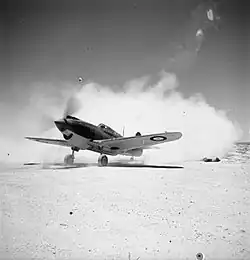 On 1 April 1941, No. 250 Squadron reformed at RAF Aqir from K Flight as No. 250 (Sudan) Squadron and by the end of the month had received enough Tomahawks to become operational on defensive duties in Palestine.[3] In May, a detachment began offensive sweeps over Syria and in June commenced operations in the Western Desert, being withdrawn in February 1942 for defensive operations.[4] After converting to Kittyhawks, it returned to the desert in April as a fighter bomber unit and provided support for the 8th Army, advancing with it through Libya into Tunisia to end the North African campaign. In July 1943, the squadron flew to Malta to support the landings in Sicily moving there a few days afterwards.[5] By mid-September it had occupied airfields in Italy where it spent the rest of the war flying fighter bomber missions. In August 1945, No. 260 Squadron disbanded and transferred its Mustangs to No. 250 Squadron which then flew them until disbanded on 30 December 1946 at Treviso, in Italy.[6]