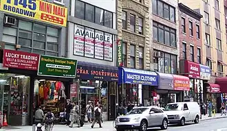 The neighborhood deteriorated somewhat during the mid- and late-twentieth century. Tee-shirt, luggage, perfume and jewelry wholesalers began lining the storefronts along Broadway from Madison Square to Herald Square, and wholesalers continue to dominate that stretch. By the second half of the twentieth century, Madison Square Park was suffering from neglect and petty crime.[19] The massive 2001 park restoration project, spearheaded by the Madison Square Park Conservancy[20] spurred a transformation of the neighborhoods around the park—the Flatiron District, Rose Hill and NoMad—from primarily commercial to places attractive for residences, upscale businesses and trendy restaurants and nightspots, especially in the early 2010s.[21]