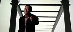 The music video was directed by American music video director Chris Robinson, who previously directed both Eminem and Lil Wayne in the "Drop the World" music video.[25] The video began shooting in June 2010.[26] A thirty-second teaser was released on September 29, 2010, on Eminem's official YouTube channel. It shows Eminem rapping inside of a recording studio, interlaced with scenes where an adolescent boy gets bullied.[27] Some of the music video was shot in front of a green screen.[28] Lil Wayne's part was filmed before he was incarcerated, according to a tweet from Eminem: "We got Wayne's verse filmed before he went away luckily. Gotta shoot the rest of a 'No Love' video real soon. Keep your head up Weezy!"[26] The official music video premiered on Thursday, September 30 on VEVO and various MTV channels at 7:56 PM EST.[15][27]