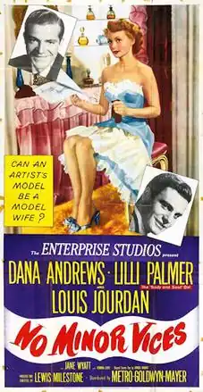 No Minor Vices is a 1948 American black-and-white comedy film written by Arnold Manoff and directed by Lewis Milestone[2] with Robert Aldrich as 1st assistant director.[3] Created for David Loew's Enterprise Productions, it was the first of three films distributed by Metro-Goldwyn-Mayer after parting ways with United Artists,[2] and was the last of four films made by Dana Andrews for director Milestone.[4]