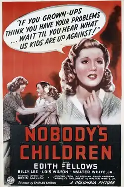 Nobody's Children is a 1940 American drama film directed by Charles Barton and starring Edith Fellows, Billy Lee, Georgia Caine and Lois Wilson. It was produced and distributed by Columbia Pictures.[1][2][3]
