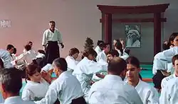 Nobuyoshi Tamura (田村 信喜, Tamura Nobuyoshi; 2 March 1933 in Osaka[1] – 9 July 2010)[2] was a prominent aikidoka and a direct student of Morihei Ueshiba. The son of a kendo teacher, Tamura entered the Aikikai Hombu Dojo in 1953[3] as an uchi-deshi (live-in student) of aikido founder Morihei Ueshiba. He was one of Ueshiba's favorite pupils and since 1964 has greatly contributed to the development of aikido in Europe and France in particular. He was the National Technical Director (DTN) of the FFAB (French Federation of Aikido and Budō). He held the rank of 8th dan and the title of Shihan. Throughout his teaching career he trained many others instructors in various countries around the world but foremost Western Europe.[2] In 1999, he received the medal of "Chevalier de l'ordre National du Mérite" from the French government. Tamura published several books on aikido in French. His dojo, Shumeikan Dojo, is located in the village of Bras, France. His former students include Jorge Rojo Gutierrez, Toshiro Suga, Pierre Chassang and Alain Peyrache.
