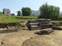 The most important necropolis was south of the city at the foot of Mount Albino in the locality of Pareti. Tombs were often in tuff from Fiano or in limestone from Monte Albino. Painted or bronze vases were found in these tombs and various objects of iron, lead, and other metals.[12] In the 1950s more archaeological excavations brought to light more than a hundred burials of the sixth and fifth centuries BC and others from the Samnite period, i.e. from the 4th and 3rd centuries BC.[13] Etruscan amphorae also testified to the city's contacts.[14]