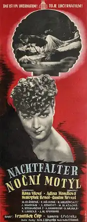 Nocturnal Butterfly (Czech: Noční motýl) is a 1941 Czech drama film directed by František Čáp based on a novel by Karel Novák.[1] It was shown in 9th Venice Film Festival where it won a prize Targa di segnalazione.[1]