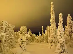 Light pollution on a ski slope in Finland gives the area a hazy, brightened sky.