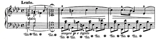 8 and the key to F minor (the relative minor of A♭ major). This initial transition is performed over a C dominant seventh chord, which is not totally foreign to A♭ and yet pushes strongly away towards the F minor B section. James Huneker found the F-minor section to "[broaden] out to dramatic reaches" though he still viewed the overall piece negatively.[6] After a tumultuous set of chromatically descending octaves at the end of the B section, the key changes to F♯ minor in measure 39 and returns to A♭ major at measure 51, where the meter also returns to 4