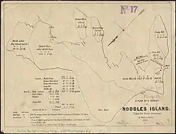 For over three hundred years, the island was known as Noddle's Island, for William Noddle, who was probably sent out by John Brereton, and settled upon it in the 1620s, before Boston was established by the Puritans. The island was used for grazing livestock and there was a fortified structure on the island. Mr. Noddle, a resident of Salem, died in 1632 when his canoe overturned on the South River, according to the journal of John Winthrop.[2]