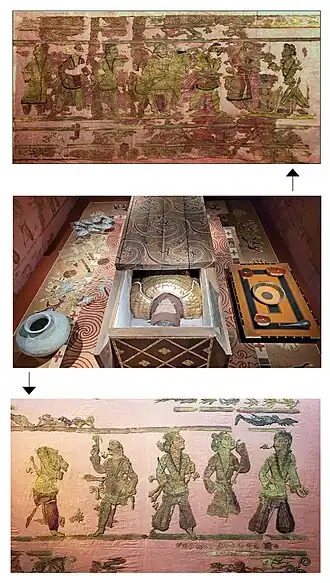 Some tombs include horse burials and one tomb had especially lavish furnishings. The coffin was apparently made in China, and the interred person had many of his possessions buried with him. His horse trappings were elaborately decorated and his leather-covered saddle was threaded with black and red wool clipped to resemble velvet. Magnificent textiles included a woven wool rug lined with thin leather with purple, brown, and white felt appliqué work, and textiles of Greco-Bactrian, Parthian or Gandharan origin.[4]