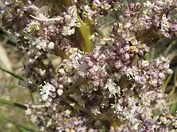 The flowering stem grows directly from the underground caudex (a scape) and will have a curve at the end. The few leaves attached to the flowering stem will curl towards their end. The floral part of the scape (the inflorescence) is repeatedly branched (paniculate) and densely packed with flowers and is very occasionally purple in color on Nolina texana.[2] The inflorescence will be 25–70 centimeters tall and 5–17 centimeters wide. The thicker side branches on the inflorescence will outwards and then upwards (ascending). The smaller leaf like structures under each branch (the bracts) are 10–40 centimeters long and will persist on the flowing stem through its lifecycle.[2]