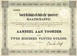 On May 28, 1869, the Noord-Brabantsch-Deutsche Spoorweg-Maatschappij (NBDS) was founded. The purpose of the company was the transport of goods and people on the railways Boxtel - Gennep - Goch - Wesel and Gennep - Kleve. The board of directors of the company was as follows:[2]