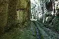 The tombs are generally constructed from large blocks of tuff carved directly into the cliff, and are entered from stairs heading down into the rock. Their cliffside construction, rather than being built on the ground, makes the tombs unusual for the Etruscans. Originally bodies were placed within stone sarcophagi that may still be found in many of the tombs.[2]