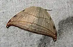 The wingspan is about 27 mm.[3] Adults are pale fawn colour, the hindwings pale yellow anteriorly. There are two oblique dark brown lines crossing both wings, between which are three small white discal spots. There is a pale submarginal line and the exterior border of both wings is defined by a brown line.[4]