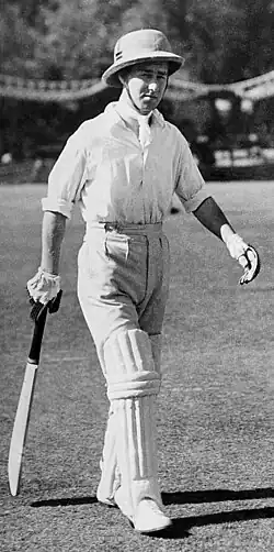 In the Tests, Yardley's only scores over fifty, his first in Test cricket, came in the third Test, where he scored 61 and 53 not out. In England's first innings, he helped his side to recover from a batting collapse, surviving for two hours. His second innings lasted 89 minutes and helped England to avoid defeat for the first time in the series. In the same match, Yardley bowled more overs than he had done previously on the whole tour, following injuries to Bill Voce and Bill Edrich, two of England's main bowlers. Bowling leg theory with a fielders concentrated on the leg side, Yardley managed to move the ball off the seam. He dismissed Bradman twice in the match, having figures of three for 67 in the second innings and taking five wickets in the match.[6][30][31] This was the first time that an England player had scored fifty runs in both innings and taken five wickets in a Test.[32] Yardley also had substantial bowling workload in the fourth Test, delivering 31 overs in Australia's first innings to take three for 101.[6] When Hammond did not play in the final Test, Yardley became captain, doing so courageously according to Wisden, which also pointed out that Yardley used field placing more effectively than Hammond.[27][33] In the series, Yardley scored 252 runs at an average of 32.50,[34] His ten wickets at an average of 37.20 placed him first in the series bowling averages.[35] He played in the drawn Test on the short tour to New Zealand which followed, opening the batting scoring 22 and taking a wicket.[6][31]
