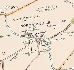 In 1886, the hamlet of Normansville (which then included both sides of the Normans Kill) included approximately 100 individuals, 22 families, and 17 dwellings.[2] In 1993, it was estimated that the Bethlehem neighborhood of Normansville consisted of 50 people, 19 homes, and one church.[12]
