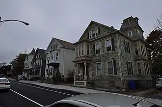 The historic district is located just north of downtown New Bedford, and is roughly bounded by four significant traffic arteries: Kempton Street to the south, County Street to the west, Parker Street to the north, and Purchase Street (running just next to the city's downtown highway connector) to the east. The area is about 60 acres (24 ha) in size, and has 400 primarily residential buildings. Most of these are single-family wood frame residences, many of them in vernacular versions of styles popular between about 1820 and 1860. Italianate features predominate, although earlier Greek Revival and later Second Empire and Queen Anne examples are also numerous. A modest number of houses are more elaborate or stylistically formal; these were typically built for wealthier businessman or merchants. There are two major non-residential properties: the St. Lawrence Church, and a state National Guard armory.[2]
