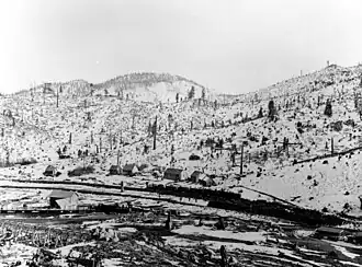 The aggressive logging activities of the Comstock Era (1860–1900) had major impacts on North Canyon Creek. In 1870, a flume was constructed within North Canyon to transport fallen logs and supply water to Spooner Lake where lumber could be transported east to Spooner Summit where they could be sent down the Clear Creek Flume to the Carson City lumberyards. Originally a shingle and mill site, much of the Spooner Lake and Glenbrook area became controlled by the Carson Tahoe Lumber and Fluming Company (CTLFC), a monopoly lumber business during the Comstock Era owning nearly one-fifth of the basin lands. Large stands of timber along the east shore of Lake Tahoe were cut during the mid-1870s and most of the clear cutting was completed by the 1880s, with the Glenbrook Railroad transported logs from the lower elevations to Spooner Summit.[4]