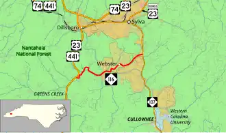 North Carolina Highway 116 (NC 116) is a primary state highway in the U.S. state of North Carolina. The highway runs east–west but is signed south–north, connecting the town of Webster between two major highways in Jackson County.