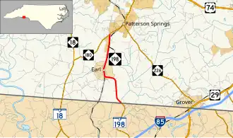 North Carolina Highway 198 (NC 198) is a primary state highway in the U.S. state of North Carolina. It connects the town of Earl with the rest of Cleveland County.