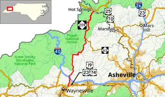 Established in 1921 as an original state route, it went from NC 10, in Lake Junaluska to NC 20, in Hot Springs.[3][4] In 1954, NC 209 was extended a .5-mile (0.80 km) south to its current southern terminus.