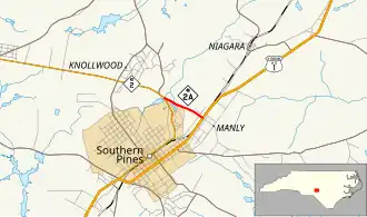 In 1951, NC 2A started at an at-grade intersection with US 1 (North May Street) in the southern portion of the community of Manly. From there, the highway ran northwesterly across the Seaboard Air Line Railroad to an intersection with a primitive trail (now Clark Street) in Southern Pines. The roadway continued northwestward to a bridge over a small, unnamed creek (now nonexistent). Turning slightly westward, the road proceeded to its northern terminus, an intersection with NC 2 (now an interchange with US 1).[1][2]