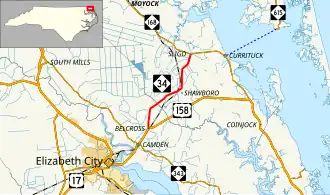 North Carolina Highway 34 (NC 34) is a short primary state highway in the U.S. state of North Carolina. Spanning a distance of 9.177 miles (14.769 km), the route passes through a few small unincorporated communities in eastern North Carolina's Inner Banks near Elizabeth City.