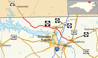 North Carolina Highway 46 (NC 46) is a primary state highway in the U.S. state of North Carolina; it is entirely in Northampton County. The route primarily connects the communities on the north side of Roanoke Rapids Lake and Lake Gaston, as well as the north side of the Roanoke River in the county.