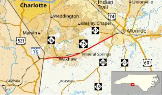 North Carolina Highway 75, also known as the Waxhaw Highway in most of North Carolina (NC 75), is a primary state highway in the U.S. state of North Carolina. Its entire length runs through Union County and serves as the primary connector between the towns of Waxhaw, Mineral Springs, and Monroe. The route roughly parallels a CSX railroad line for its entire span.