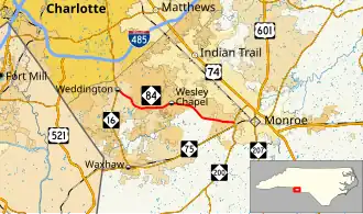 North Carolina Highway 84 (NC 84) is a primary state highway in the U.S. state of North Carolina. It serves to connect the town of Weddington to the city of Monroe.