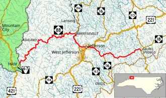 North Carolina Highway 88 (NC 88) is a 41.3-mile-long (66.5 km) primary state highway in the U.S. state of North Carolina. Primarily in the High Country, it runs from the Tennessee state line near Trade east to NC 18 in Laurel Springs.