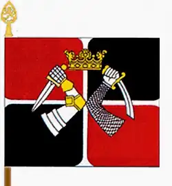 The brigade flag consisted of a white cross, dividing the flag into red and black quarters. The cross is overlaid by the dueling arms and crown of the coat of arms of the Province of Karelia. Designed by Juhani Vepsäläinen, the flag was assigned to the brigade on 27 June 1991.[1]