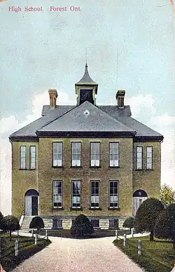 Until the 1880s, students seeking to go beyond a basic elementary school education would have to board in larger centers such as Sarnia, where a district grammar school had been established in 1844. The abolition of the district grammar schools in 1871 led to the creation of collegiate institutes and high schools, the former devoted to traditional forms of education and the latter catering to male and female students in subject areas like English and the natural sciences. Students living in larger cities who planned to further their education at university were more likely to attend collegiate institutes. However, in communities such as Forest the development of high schools provided a base for those wishing to continue their studies at normal school or university.[1]