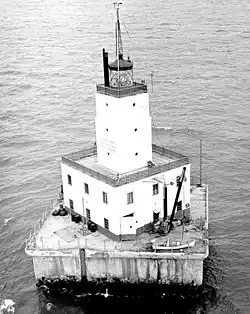 In 1923, the Lighthouse Board first proposed replacing the lightships with a permanent station.[5] However, funds were not allocated for the purpose until 1933, when they were made available through the Public Works Administration. In 1935, the permanent steel light station was constructed on the shoal in 26 feet (7.9 m) of water. The station was originally manned by a three-man crew, but in 1980 the light was automated and the station abandoned. The original Westinghouse Airway Beacon light was changed and replaced several times over the years, and is currently a solar and battery powered LED beacon.