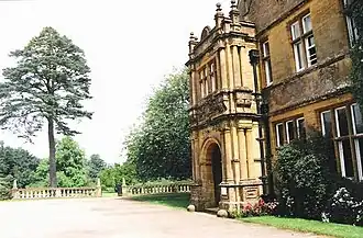 The L-shaped two-storey hamstone building has clay tiled roofs. The front of the building has a porch with an archway flanked by Doric columns.[1] To the south side of the building is an orangery the roof of which was replaced after bomb damage in World War II.[1]