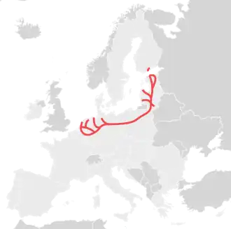 The original corridor of the Core Network to be called Warsaw–Midlands[3] (route Warsaw – Poznań – Frankfurt (Oder) – Berlin – Hannover – Osnabrück – Enschede – Utrecht – Amsterdam/Rotterdam – Felixstowe – Birmingham/Manchester – Liverpool),[4] but following the exit of the United Kingdom from the European Union following Brexit, the axis would no longer reach the British Islands, therefore it was enlarged and redesigned according to the current route from Helsinki to the Benelux.[5]