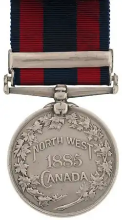 The North West Canada Medal is a British campaign medal issued to the soldiers, volunteers, and North-West Mounted Police (NWMP) personnel who participated in putting down the North-West Rebellion in 1885.[3]
