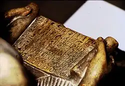 The statue depicts Sekhemka sitting in a traditional scribal pose and holding on his knees a partly unrolled papyrus which lists various offerings. He is named in an inscription on the plinth of his statue as "Inspector of Scribes in the House of Largesse, one revered before the Great God". His wife Sit-Merit is shown sitting at his feet. The limestone statue is 75 centimetres (30 in) tall with the base from front to rear being 43 centimetres (17 in).[4] Archaeologist Mike Pitts, editor of British Archaeology, took many detailed colour photographs of the statue whilst it was on display in Christie's prior to auction and has published them on his own blog.[5]