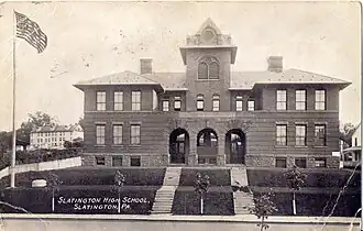 The first school within the present limits of Slatington was in the old stone mill in Lower Slatington in 1820 which was built by William Kern, but it was only operated for a year or two. The next school was opened in 1858. At this time, a Welsh Church divided and the School Directors of Washington Township rented the stone church building located on West Church Street in the borough. This building was used for school purposes until 1868. A school also operated for a time in the second story of the Lehigh Slate Company's store.