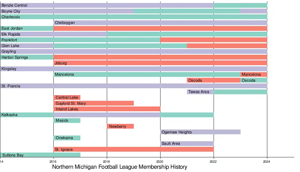 For the 2017 season, more changes will be happening, as four schools will be making the move to eight-man football. In the last few months of 2016, Central Lake,[4][5] Mesick,[4][5] Onekama,[6] and Suttons Bay[5] all announced moves to the eight-man game. However, for the 2018 season, Newberry, from the former Mid Eastern Football Conference, was brought into the league.[7] This did not last long, however, as for the 2019 season, Newberry, along with Gaylord St. Mary announced their own move to the 8 man game as well. Starting in 2020, the league will welcome Sault Ste. Marie and West Branch-Ogemaw Heights, who both previously were independent. In corresponding moved Kalkaska and Boyne city will move from the Legends Division to the Leaders Division, and Frankfort will move from the Leaders Division to the Legacy Division. This aligns the league, with the exception of Traverse City St. Francis, to divisions based on enrollment sizes, with the Legends being the largest, Leaders being the middle, and Legacy being the smallest schools.[8]