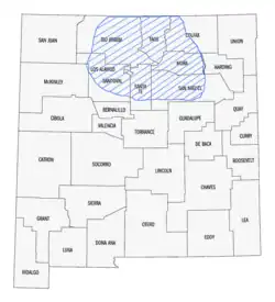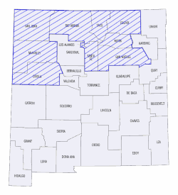 The traditional southern boundary of the area is an escarpment called La Bajada southwest of Santa Fe.[1] The other boundaries are poorly defined. The map in Cobos (1983) is a guide: from La Bajada the boundary runs northwest about 50 miles (80 km) west of U.S. Routes 285 and 84, and northeast about 20 miles (30 km) east of Interstate 25, to the Colorado border. The area might also be described roughly as comprising Rio Arriba, Los Alamos, Taos, and Colfax Counties; northeastern Sandoval County, northern Santa Fe County; and western San Miguel and Mora Counties, possibly with parts of adjoining counties. To the west is the Four Corners region; to the east are the high plains of Eastern New Mexico.