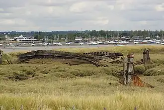 ![]() The remains of a pair of Thames barges on Northey Island | |